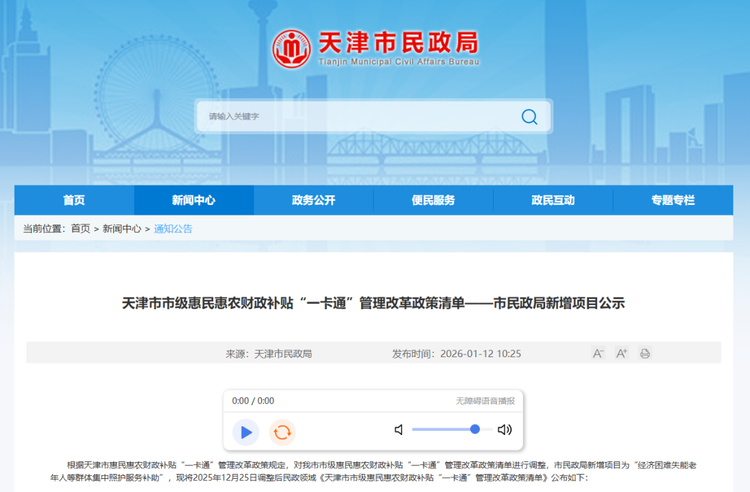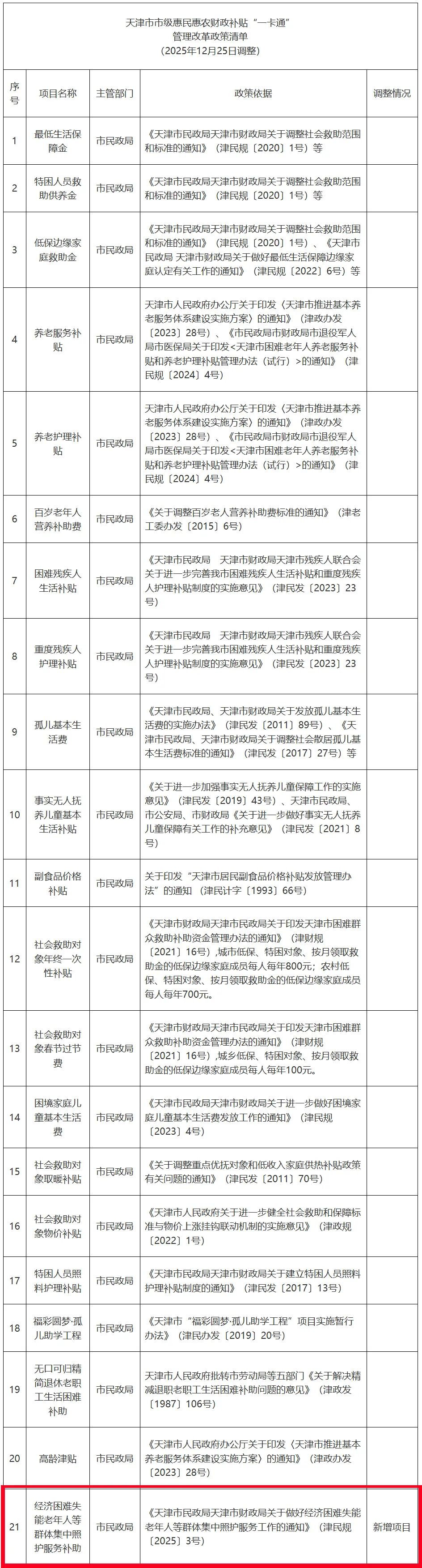 1月12日,天津市民政局发布“天津市市级惠民惠农财政补贴‘一卡通’管理改革政策清单——市民政局新增项目公示”,根据天津市惠民惠农财政补贴“一卡通”管理改革政策规定,对我市市级惠民惠农财政补贴“一卡通”管理改革政策清单进行调整,市民政局新增项目为“经济困难失能老年人等群体集中照护服务补助”。 ![]() 现将2025年12月25日调整后民政领域《天津市市级惠民惠农财政补贴“一卡通”管理改革政策清单》公布如下: ![]() |